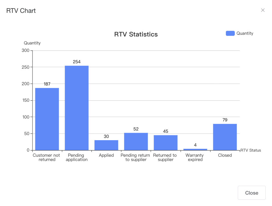 Warranty provider can access the “RTV Return to Vendor” module to review detailed progress information for all products pending return to vendors via the RTV list. In addition, the system provides a dashboard with graphical charts to display overall RTV progress in real time, allowing warranty provider to intuitively track project status and execution progress.