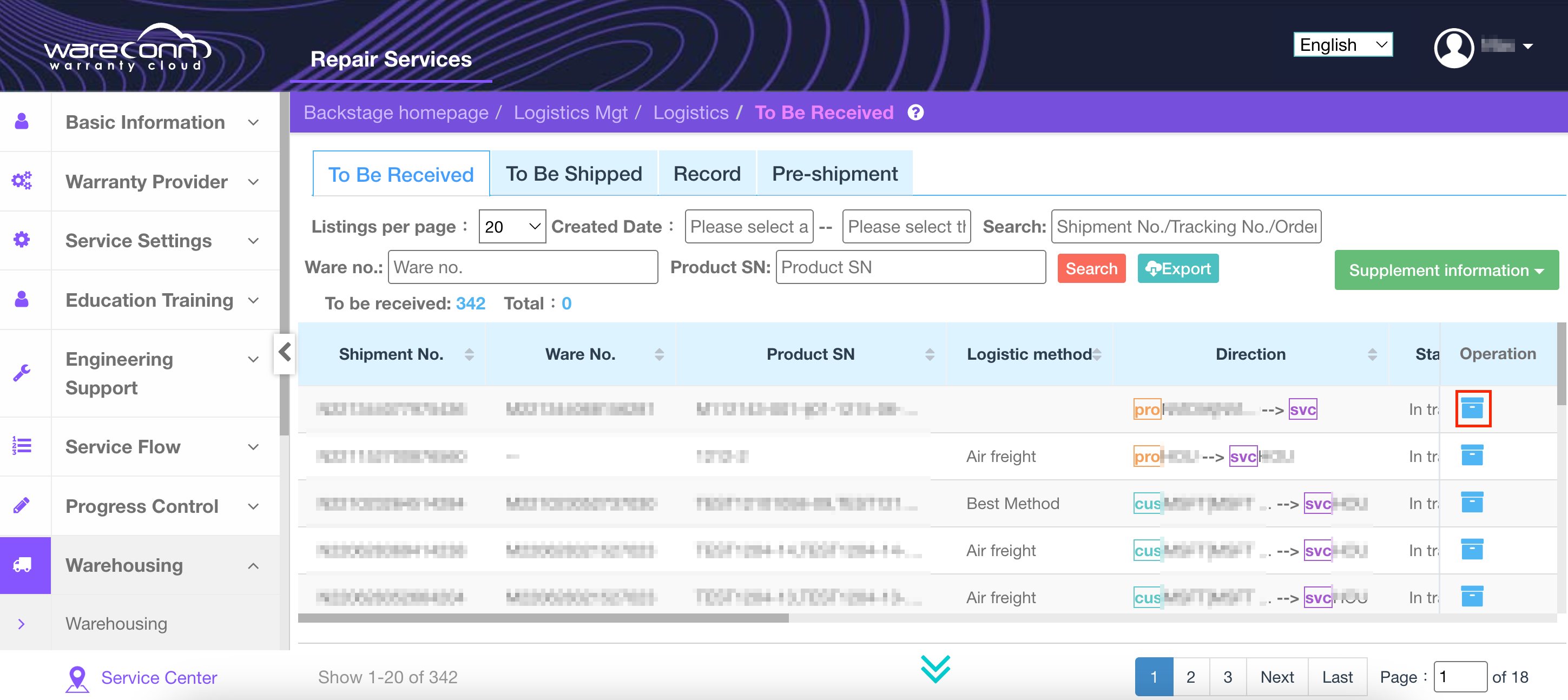 After the vendor returns the repaired products, service center can search for the corresponding order in “To Be Received.” Upon verification of product information, the products are received into the spare parts warehouse for subsequent customer warranty support.