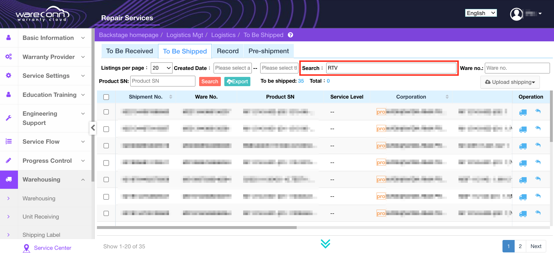 Service Center search for shipment orders in "Logistics → To Be Shipped" and use the "RTV" filter, fill in the logistics information, and confirm the shipment.